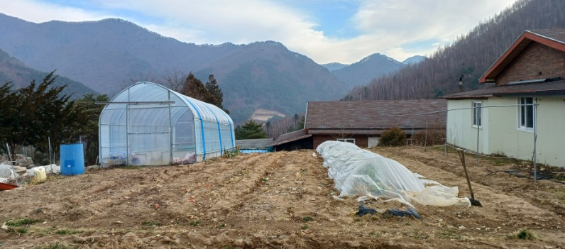 주택 좌측 옆 텃밭과 비닐하우스 모습입니다.