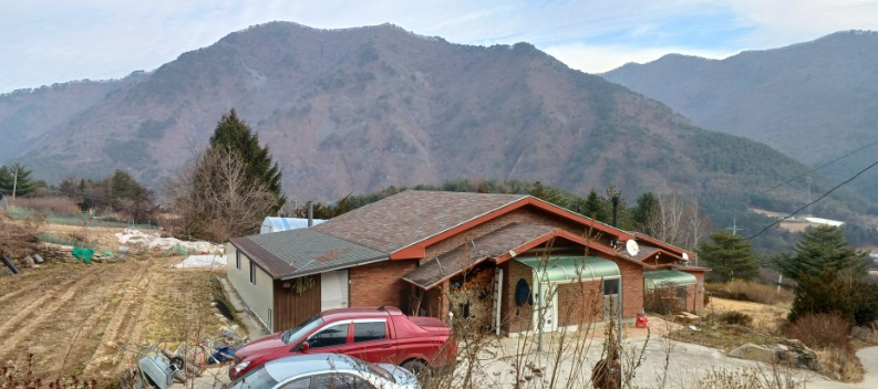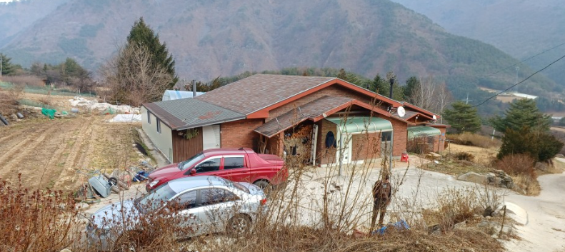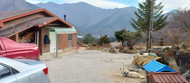 전원주택 우측 옆이 주차장과 작업장으로 사용되고 좌측옆과 뒤가 약 300평으로 텃밭으로 사용합니다.
