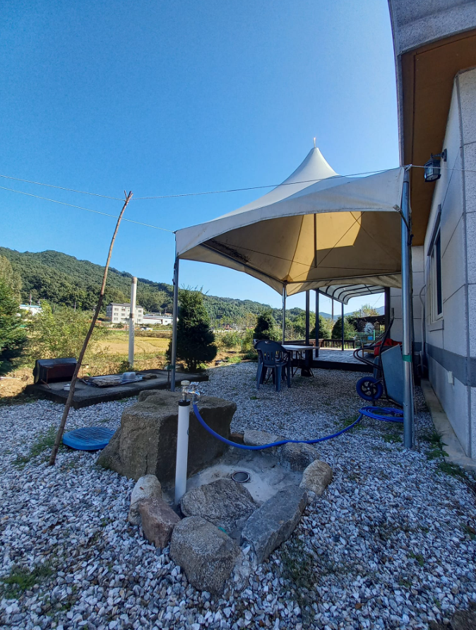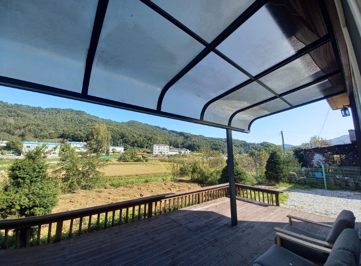 기름보일러, 붙박이장, 에어컨, 테라스 데크, 지하수, 텃밭아래는 하천이고 뒤로는 낮은 산