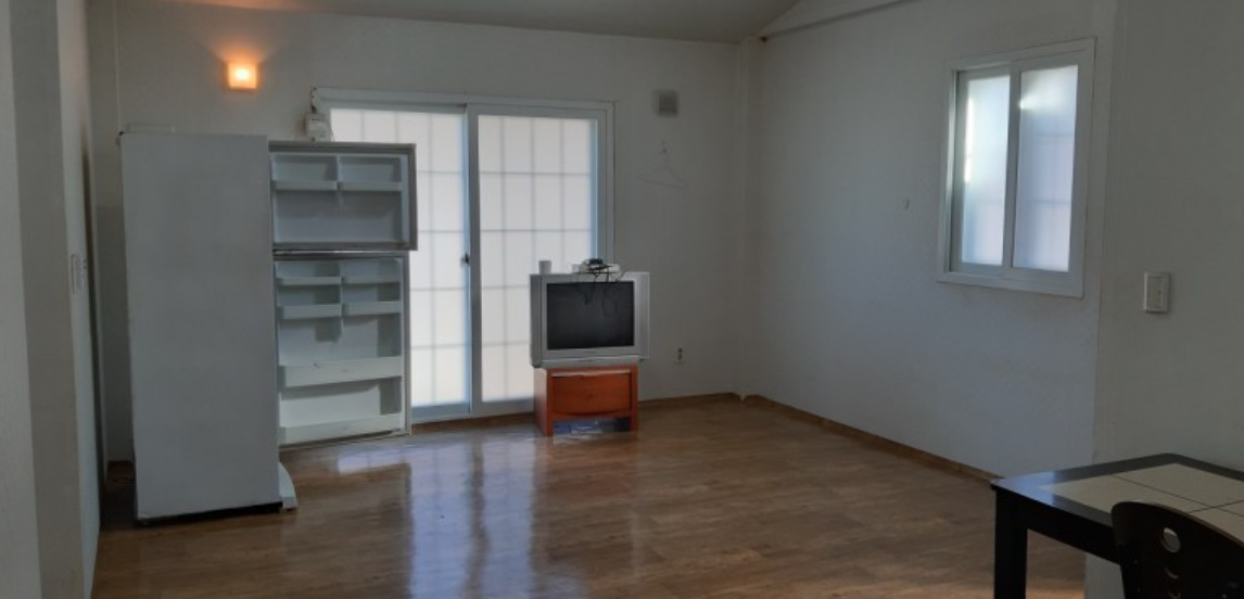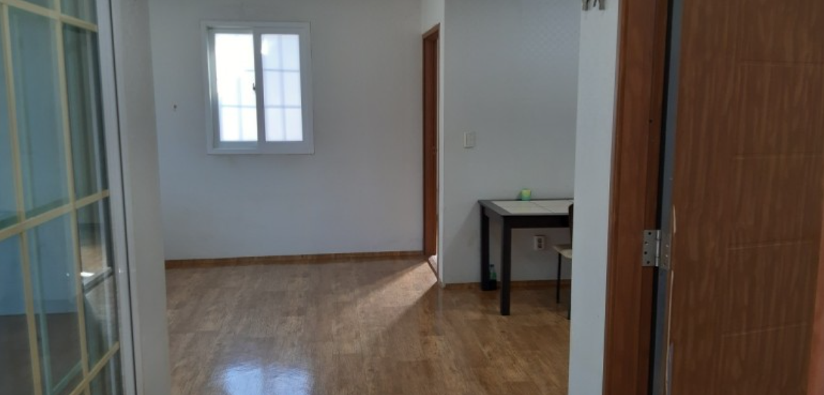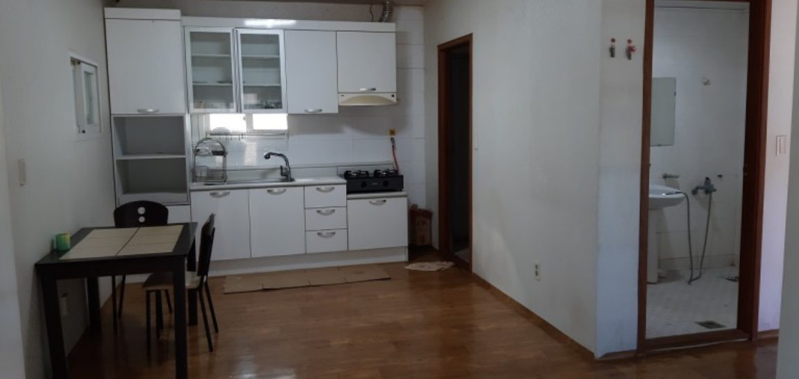 중문을 열고 들어가면 정면에 화장실이 있고 우측으로 거실겸 주방 그리고 안방이 위치하고 좌측으로 작은방이 있습니다